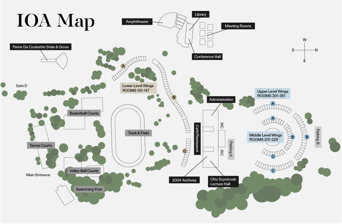 The IOA’s campus is surrounded by beautiful natural landscapes, with gardens and outdoor spaces where participants can engage in informal discussions, reflection, and relaxation. The outdoor environment contributes to the peaceful, inspiring atmosphere of the Academy, aligning with the values of the Olympic Movement.